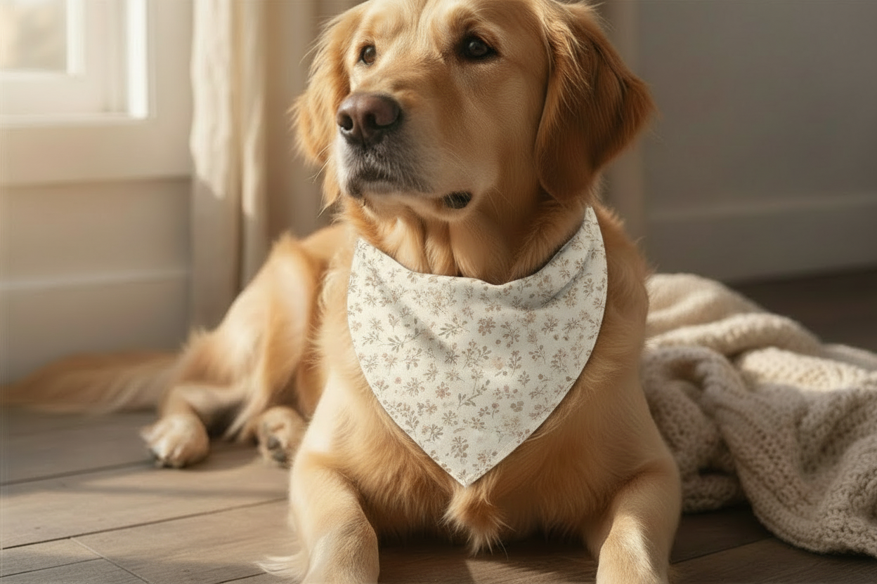 A soft, scattered floral inspired by dried winter blooms and vintage wrapping paper. Muted terracotta, olive, and warm neutrals create a calm, seasonless look that feels cozy without being holiday-specific. Perfect for pups who wear florals year-round.